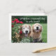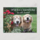 This funny meme postcard features a photograph of two golden retriever dogs who are laughing at a joke. The joke reads, "What does a scientist's dog do with bones?" Text on back reads, "BARIUM. Hardy ha ha."