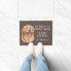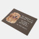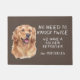 "No need to knock twice, We have a Golden Retriever" declares this cute door mat. The text is in white at the right side, while a picture of a beautiful Golden Retriever dog is at the left. Everything is placed on a grey brown background.