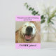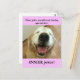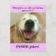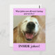 Everyone likes a good pun, especially doggies! This postcard features a photograph of a laughing golden retriever, who asks the question, "What jokes are allowed during quarantine?" The answer? "Inside jokes!" Customisable text on back says, "Stay safe!" Perfect to send to friends and family who are self isolating during the Covid-19 crisis.