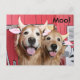This funny Halloween postcard features a photograph of two golden retriever dogs who are dressed as cows and looking out from inside a red barn. The front reads, "Moo!" while the text on back reads, "We mean BOO! Happy Halloween!" A joke is included! Why did the cow cross the road? To get to the udder side! All text can be changed or deleted.