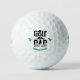 Custom personalised golf balls with the saying 'Golf Dad ' in black typography. The 'o' in the word golf has a black hat above it and there's a black moustache in the phrase between the words golf and dad. In green typography are your first and last initials along with a name on the bottom all of which can be edited . Add your first initial on the left, your last initial on the right and your own name on the bottom.