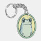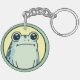 Cute round keychain of a funny green cartoon frog with big eyes and a deadpan look on his face on a yellow and green background.