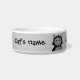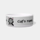 A silly kitty in black and grey holding a toy mouse on a cat dish. You can add your cat's name 3 times around the bowl.