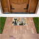 Funny doormat featuring a cute black cat on a grunge painted background in ochre, ivory and black, with a paw print.