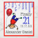 Celebrate his 21st, 30th, 50th, 60th or any age birthday in style with this funny and whimsical label. A cute stick figure boy with a red balloon. Your name and birthdate are personalised with "Finally 21". Blue curly streamers make this waterproof and scratch resistant label perfect for your fun celebration. Customise all text, fonts and border colour. To view more party favour products, please visit "The Hungarican Princess - A Boutique™" @zazzle.com/hungaricanprincess. Congratulations and Happy Birthday.