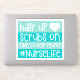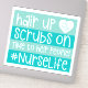 Funny Hair up, scrubs On, Time to Help People Decal Sticker. Sticker is outlined in white with blue green and a stethoscope. You can use it on a laptop, luggage, skateboards, and much more.