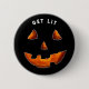 Halloween season button pin or party favours featuring a jack-o-lantern pumpkin and the words: Get Lit.