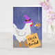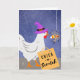 Chick N Scratch, funny Halloween greeting card featuring a chicken wearing a witch's hat and staring at a spider holding a piece of candy corn. The background is filled with spider webs. Inside message has chicken themed Halloween puns. Art, image, and verse copyright © Shoaff Ballanger Studios, 2022.
