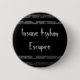 A funny pin on button for Halloween or anytime in black and grey. The wording reads "insane asylum escapee".
