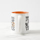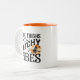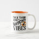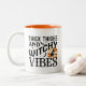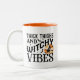 "Thick Thighs and Witchy Vibes" funny two-toned coffee mug features simple black typography along with a festive Halloween theme, whimsical orange full moon and a witch on her broomstick. This coffee and tea mug is customisable and makes a great gift idea for Witches and Halloween lovers.
