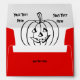 This Halloween pumkin image on this great customisable halloween envelope is a black outlined pumpkin with a funny expression carved out as its face. The Halloween images looks great on this quality red envelope, I’m sure anyone who recieves this funny pumpkin face invitation for Halloween day, or any other occasion, will smile the envelope matches the halloween pumpkin invitation. This original customisable halloween envelope can be personalised with your own text.