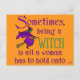 This cute Halloween witch postcard sort of paraphrases a line from a thriller / horror novel and movie, but here, the word "Witch" has a w instead of a b. This humourous postcard is for women who are witchy and proud of it. It includes an image of a green witch wearing purple and riding a broom. The background is bright orange.