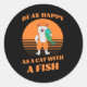 Funny happy cat holding a fish. Funny Feline Classic Round Sticker