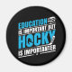 Funny hockey themed magnet with blue and white text on a black background reads Education is Important But Hockey is Importanter!