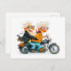 A funny illustration of an old man and woman riding a motorcycle together, smiling with wind in their hair. A humourous and colourful caricature full of freedom, adventure and retirement fun.