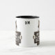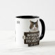 On two sides of this cute mug is an image of a grey and white tabby cat holding a sign that says "INTROVERT, but willing to DISCUSS CATS". Between the images is your custom text, name, or monogram.