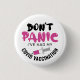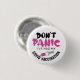 Humourous covid vaccine button featuring a simple white background that can be changed to any colour, the words "don't panic I've had my covid vaccination", and a medical syringe.