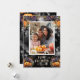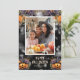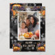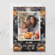 Custom photo Halloween card featuring a photo and jack-o'-lanterns wearing black hats on the front and at the back. Easily personalise this watercolor photo Halloween card with your photo and the family name. This beautiful Halloween card can be turned into any colour using the customisation tool.
