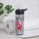 Funny water bottle with a magenta cat asking WHAT when she was caught for swallowing whole a fish.