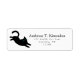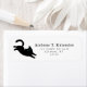 This customisable typography and script return address label design features cute, funny jumping acrobat black cat art silhouette.