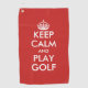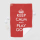 Funny keep and calm and play golf towel gift. Personalised presents for him or her. Unique golfing gifts for men and women. Humourous Birthday gift ideas for legendary golfer, husband, dad, father, friend, co worker, boss, colleague, coach, instructor, trainer, teacher, grandpa, retired person, golf lover etc. Including hook to hang it up. Unique golf accessories for friends and family. Customisable keepcalm typography template with vintage crown. Red or custom background colour. Other examples: keep calm and carry on, Keep calm and party on etc.