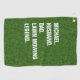 A bold Lawn Mowing Legend golf towel featuring clean white typography set against a realistic grass-textured background.