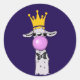 A sticker with a whimsical llama blowing a pink bubble while chewing gum. Wearing a gold crown and a black bow tie. Dark purple background.