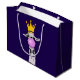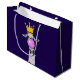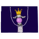A gift bag with a whimsical llama blowing a pink bubble while chewing gum. Wearing a gold crown and a black bow tie. Dark purple background.
