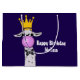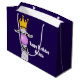 A personalised birthday gift bag (large size) with a whimsical llama blowing a big pink bubble while chewing gum. Wearing a gold crown and a black bow tie. Dark purple background.