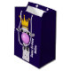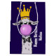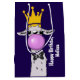 A personalised birthday gift bag with a whimsical llama blowing a big pink bubble while chewing gum. Wearing a gold crown and a black bow tie. Dark purple background.