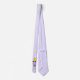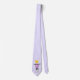 A tie with a whimsical llama blowing a pink bubble while chewing gum. Wearing a gold crown and a black bow tie. Light purple background.
