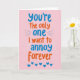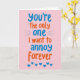 This charming card shares a loving message with a wink of humor, reading, “You’re the only one I want to annoy forever.” Set against a soft pale pink background, the hand-lettered text stands out in cheerful blue and warm orange tones. The rounded lettering feels personal and friendly, like a note written just for someone special. Subtle accent lines highlight key words, adding movement and character without distracting from the message. Small deep blue hearts scattered below bring in a sense of devotion and warmth. The balance of color, spacing, and thoughtful details creates a card that feels affectionate, honest, and full of personality—perfect for celebrating a love that’s built on laughter and closeness. ❤️