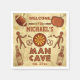 Create your own humourous, custom "man cave" paper napkins using this easy DIY template. Made to look like the wall of a cave, the napkins have primitive drawings of men throwing darts, a dart board, a TV, a football, two baseball bats, two baseballs, two pretzels and a couple retro beer bottles. The napkins can be easily personalised with your name and the year your home bar or "man cave" hideout was established. The whole design is in shades of brown, yellow and a little red.