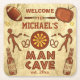 Create your own humourous, custom "man cave" pulpboard paper coaster set using this template. Made to look like the wall of a cave, the coasters have primitive drawings of men throwing darts, a dart board, a TV, a football, two baseball bats, two baseballs, two pretzels and a couple of retro beer bottles. The coasters can be easily personalised with your name and the year your home bar or "man cave" hideout was established. "Welcome" and "to" are also changeable if you'd like - but the "Man Cave" words are part of the design. The whole coaster is in shades of brown, yellow and a little red. "Customise It" to make more changes, such as resizing text. These are the ultimate, funny man cave coasters for your male sanctuary!