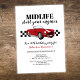 Celebrate turning 50 in style with this midlife-themed birthday invitation, where nostalgia meets humour. Featuring bold “Midlife” text, a classic red convertible, and the fun phrase “Start Your Engines” in a flowing script, this design captures the spirit of the ride ahead. A black-and-white chequered pattern adds a vintage racing vibe, while the back reads “Join us for a bumpy ride”—a perfect wink to midlife adventures. With a clean, modern layout and all details in a classic serif font, it’s ideal for party hosts who want something lighthearted yet stylish.