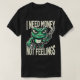Make a statement with this bold 'I Need Money, Not Feelings' graphic T-shirt featuring a tough-looking frog holding cash and a knife. Perfect for those who appreciate dark humour, edgy designs, and unique fashion, this shirt is sure to turn heads and spark conversations. Ideal for casual wear, parties, or as a fun gift for friends who love quirky and daring designs. Comfortable and available in various sizes and colours, this T-shirt lets you showcase your humour and style. Grab yours today!