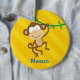 Personalised Button/Pin featuring a funny monkey in the jungle with a yellow stripe background. Cute and fun design for special for boys. Custom monogrammed gift. For no personalisation, delete sample text and leave blank.
