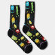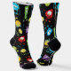 Fun crew socks with a black background and lots of silly monsters in yellow, blue, purple, red, and green!
