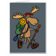 Funny moose equipped with backpack, hiking boots, and walking stick is hiking in the wilderness in this fun cool original art design.