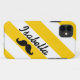 FUN, CUTE, RETRO BLACK MUSTACHE DESIGN WITH GIRLY, YELLOW AND WHITE STRIPES PATTERN, PERSONALIZED WITH YOUR NAME IN A BOLD CURSIVE FONT. ELKE CLARKE© A STYLISH GIFT FOR HER. FOR OTHER COOL COLORS PLEASE CONTACT STORE OWNER.