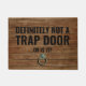 Funny welcome mat featuring a printed wooden background, door handle, and the saying "DEFINITELY NOT A TRAP DOOR....OR IS IT?"