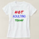 "NOT ADULTING TODAY" is the humourous text on this t-shirt. It has bright red, blue and green colours, and a doodled face on the 'O' of NOT.