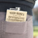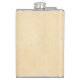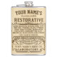 This humourous custom flask design is made to look like an old Victorian or Edwardian newspaper advertisement bottle label for a miraculous "cure all" remedy made by a quack medical doctor. The background looks mottled and slightly worn and the text reads, "[Your Name's] patented Restorative / cures headache, spasms, pain, nervous fits, hysteria, blues, typhoid, heart palpitations, seasickness, flatulence, consumption, fainting spells, black death, and leprosy / may cause blindness / best quality guaranteed / prepared at the [your name's] medical laboratory."