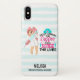 A phone case with a humourous saying: First i drink the coffee, then I save the lives. Perfect for nurses. Featuring an illustration of a female nurse wearing a cute old fashioned nursing hat and carrying a giant hypodermic needle. Light blue and white striped pattern background.