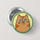 Cute round button/pin of an orange cartoon cat with a serious looking face on a yellow and green background.