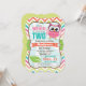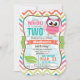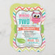 Funny, Cute owl, spring colours theme children's, girl's birthday party invite on bright colourful girly chevron pattern. Features girly patterned pink owl and green leaf on orange, lime green, teal, coral, white, and aqua turquoise chevron stripes. "TWO" and 2nd birthday can be personalised to other birthdays for toddlers, kids, or babies, baby.