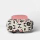 This kid's backpack has a cute all over print comprised of funny panda bear images and paw prints. Predominant colours are black, pink, and a bit of teal green on a creamy white background. The back pink pocket has your child's name in black.