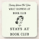 What's your book club name? Clever Reading Between The WInes bookclub coaster to hold your favourite wine glass or other beverage glass, mug or cup. Cool retro style typography with vintage winking woman. Funny quote is your new book club motto "What Happens At Book Club, Stays At Book Club". Keep on reading!