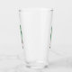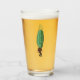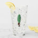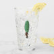 This glass tumbler for beverages has a funny man in a brown suit with a big green pickle for a head with a surprised looking face on the front and back.