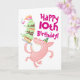A happy pig on a birthday card. Use "Personalise this template" and change the age to create a unique, customised card. A card featuring a gleeful pig, beneath a teetering layer cake with lashings of green icing and topped with pink candles.